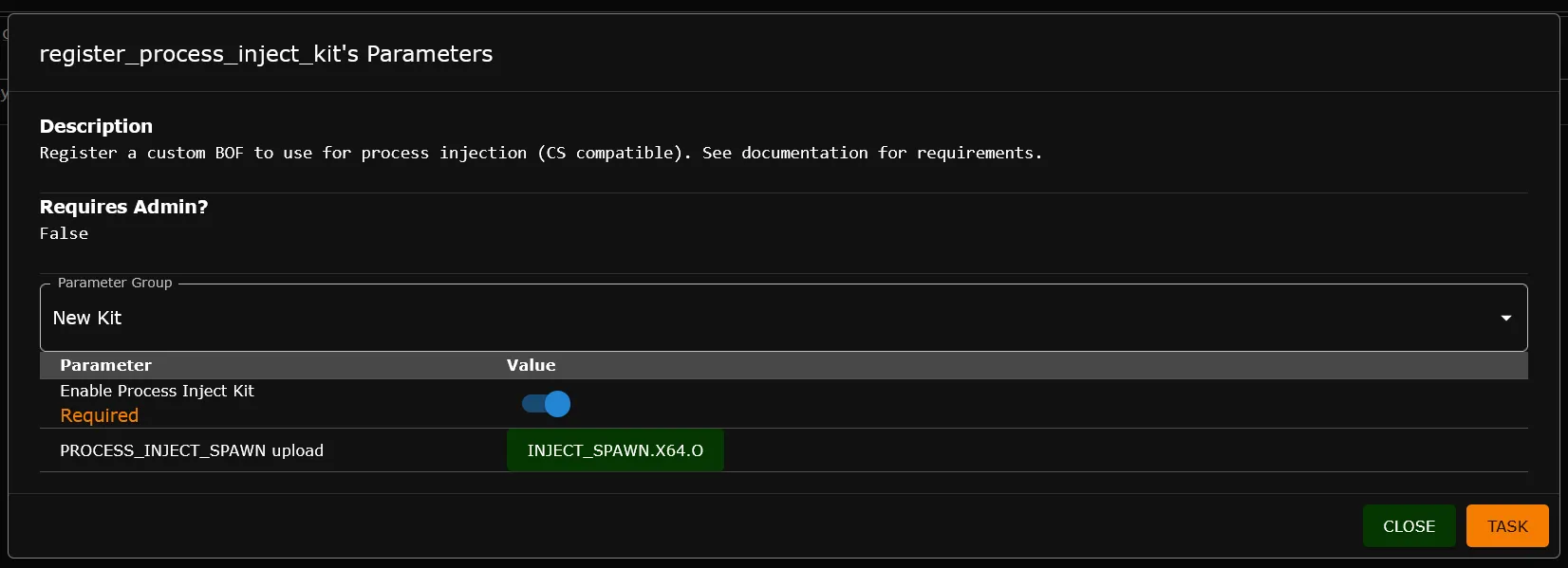 Process Injection Kit's are implemented as Beacon Object Files (BOFs) and uploaded through the modal.